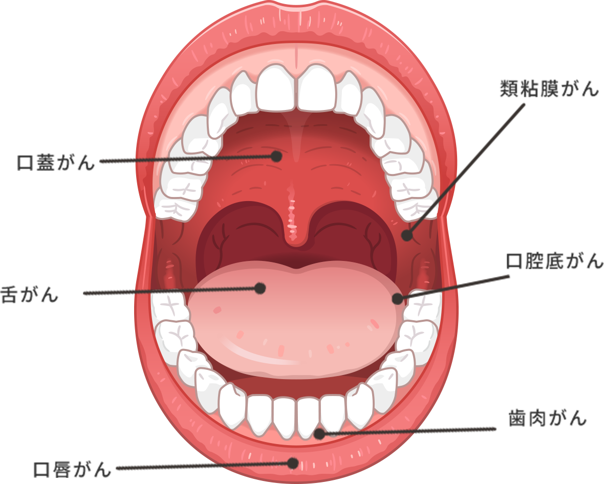 口腔がんには癌腫(舌がん、歯肉がんなど)、肉腫(顎骨の骨肉腫など)、造血器の悪性腫瘍(首や顎骨内の悪性リンパ腫など)といった種類があります。中でも、癌腫の舌がんや歯肉がんは口腔がんの中でも発生する割合が高いとされています。