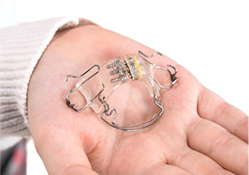 永久歯が生え揃うスペースを確保するために使用する、顎を広げる装置です。スペースが狭いためにデコボコに並んでいる歯列を矯正します。食事の際にはプレートをご自身で取り外せるので、プレートを清潔に保てます。